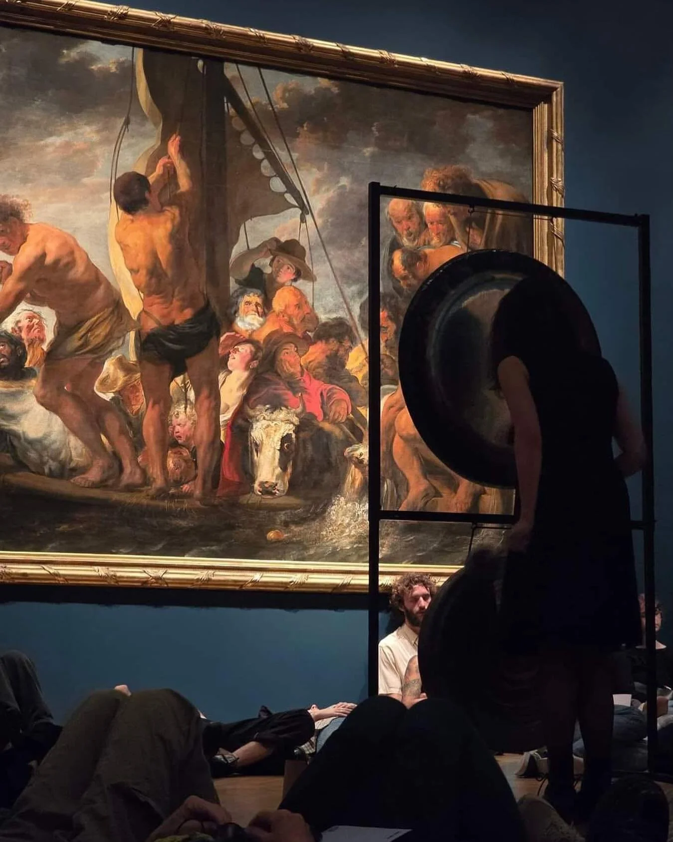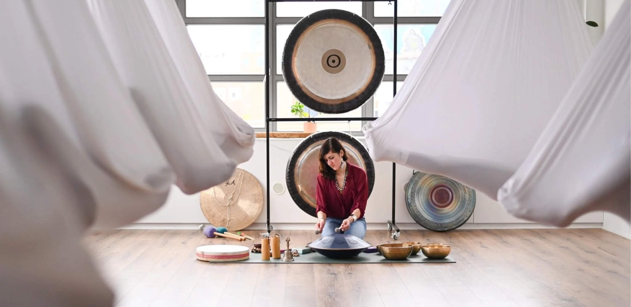 Participants rest in aerial hammocks, gently lifted above the ground, while layered gong vibrations move through the space.